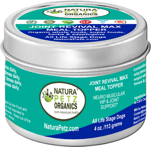 Along with its tonic and adaptogen reparative potential mechanisms, JOINT REVIVAL MAX MEAL TOPPER contains other nutritional potential benefits, related to its diverse plant and marine extracts with primary functions as prebiotic and probiotic, digestive enzymes and digestive tonic  actions (immune health is directly linked to gut health), anti-inflammatory, anti-rheumatic, anti-mutagenic (cellular gate keeper that helps protect healthy cells, may help work to destroy irregular cells as well as may help work to scavenge irregular tissues and growths in the body.) These extracts are recognized by the World Health Organization as some of the most important ingredients in the natural treatment to help address all forms of joint problems. And we're just getting started! :)  (* As recommended by holistic veterinarians for use under a traditional medical system)
